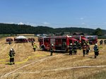 Da das Feuer bereits auf das angrenzende Wohnhaus übergegriffen hatte, wurde von der ortsansässigen Feuerwehr die Alarmstufe 2 ausgelöst.