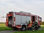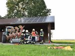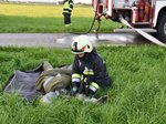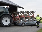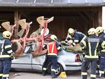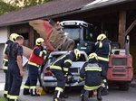 Aufgrund dieser Alarmierung wurde bereits während der Anfahrt zum Übungsobjekt das TLFA-B zur Personenrettung und das LF-A zur Errichtung einer Löschwasserversorgung beauftragt. Beim Eintreffen konnte festgestellt werden, dass ein PKW mit einem Pflug kollidiert und drei Personen im seitlich nicht zugänglichen PKW eingeklemmt waren. Es wurde sofort ein innerer Retter ins Fahrzeug abgestellt, ein doppelter Brandschutz aufgebaut und alle Geräte für die Personenrettung vorbereitet. Der Entstehungsbrand im Motorraum wurde mittels Handfeuerlöscher und HD- Rohr schnell unter Kontrolle gebracht und ein Übergreifen auf die Fahrzeughalle mit montierter PV- Anlage verhindert. So konnten in weiterer Folge die ersten beiden Personen rasch gerettet werden.